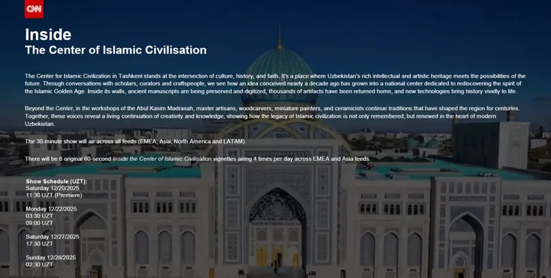 В 30-минутной программе зрителям по всему миру покажут, как в Узбекистане соединяются история, культура и современные технологии — от древних рукописей до интерактивных экспозиций. Материал выйдет на международных платформах CNN в Европе, Азии, Африке, на Ближнем Востоке, в Северной и Латинской Америке.