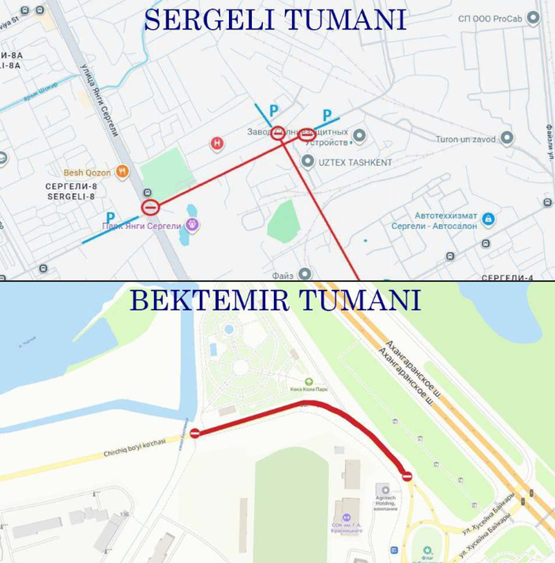 - Улица Сугдиёна от пересечения с улицей Янги Сергели до пересечения с улицами Жалоир и Багрикенг;