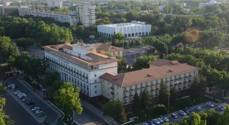Для справки: данная гостиница была спроектирована известными архитекторами Митхатом Булатовым и Леонидом Карашем и в своё время построена для приёма высокопоставленных гостей и делегаций. Она считается одной из первых гостиниц в Ташкенте, оснащённых плавательным бассейном.