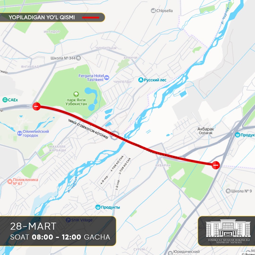 — улица Янги Ўзбекистон — от участка напротив университета CAU (Центральноазиатский университет) до Паркентской автомагистрали.