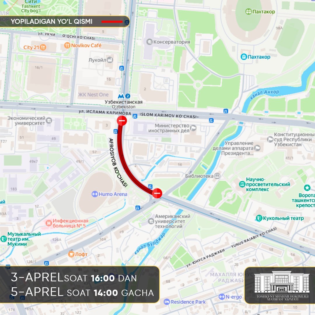 — улица Афросиаб — от перекрёстка с улицей Шарафа Рашидова до перекрёстка с улицей Шахрисабз;