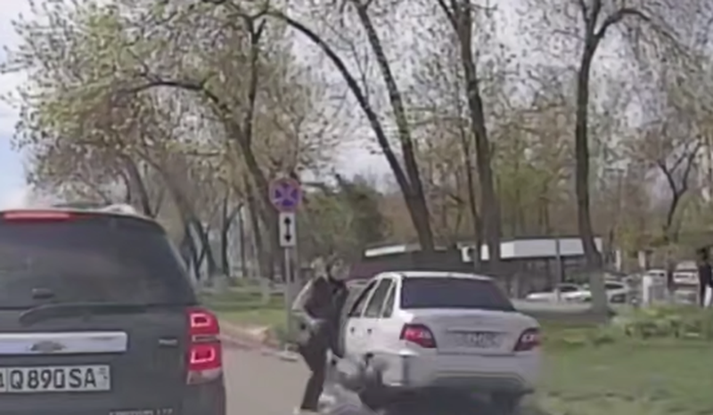 На видео можно увидеть, как две девушки переходят дорогу, лавируя между машинами. Водитель "Нексии" вывернул руль и угодил в арык после наезда.