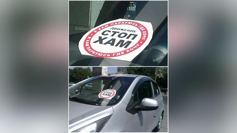 Данный стикер имеет отличия от оригинала: по содержанию («мне плевать на всех – паркуюсь где хочу») и по размеру. О том, как давно на улицах Ташкента появились активисты, сколько их, и где они проводят свои рейды, пока неизвестно. При этом официальной информации о запуске проекта в Узбекистане на официальном ресурсе «Стопхам» пока нет.