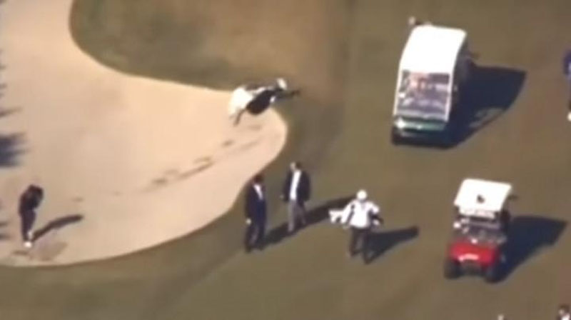 Синдзо Абэ сначала потратил немало времени на то, чтобы выбить мяч из песчаной ловушки. Когда же ему это удалось, политик выскочил из ямы, но затем потерял равновесие и упал обратно. Глава Белого конфуз своего коллеги не увидел, так как был повернут к нему спиной.