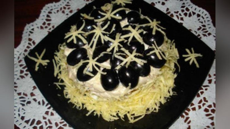 Обмазать майонезом, посыпать сыром. Украсить виноградом.