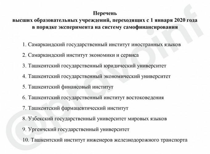 Напомним, Постановлением утвержден перечень 10 высших образовательных учреждений, переходящих с 1 января 2020 года в порядке эксперимента на систему самофинансирования. Согласно постановлению, срок оплаты контрактов студентов, обучающихся на платно-контрактной основе в ВОУ, переходящих на систему самофинансирования, определяется договором по согласованию сторон.