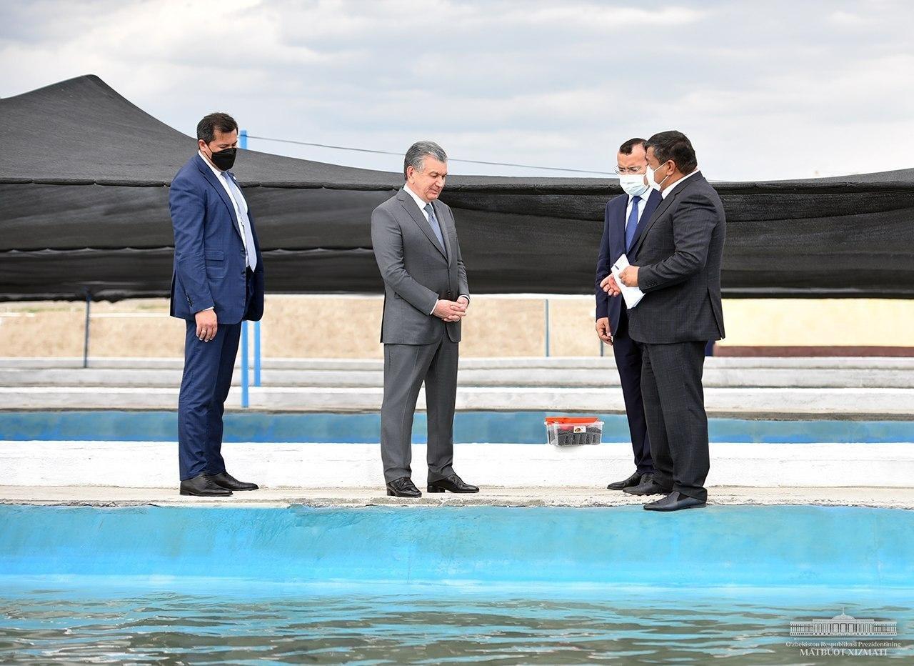 В ходе поездки по Наманганской области Шавкат Мирзиёев ознакомился с деятельностью действующего в Учкурганском районе предприятия "DB Group Eco" по выращиванию редких пород рыб на реке Нарын.