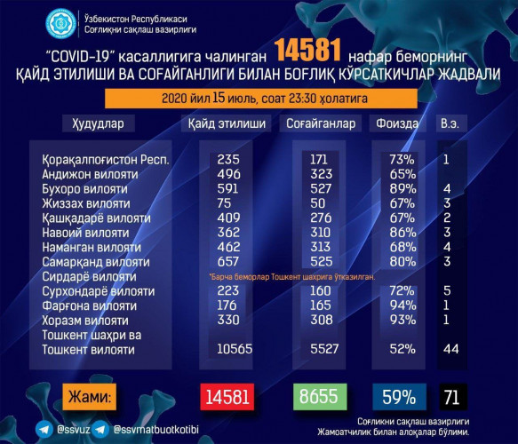 В Узбекистане зафиксирован 71 летальный исход в статистике распространения пандемии, 15 июля официально было сообщено о 4-х смертях пациентов:
