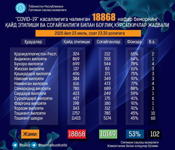 В Узбекистане зафиксировано 102 летальных исхода в статистике распространения пандемии, 23 июля официально было сообщено о 4-х смертях пациентов: