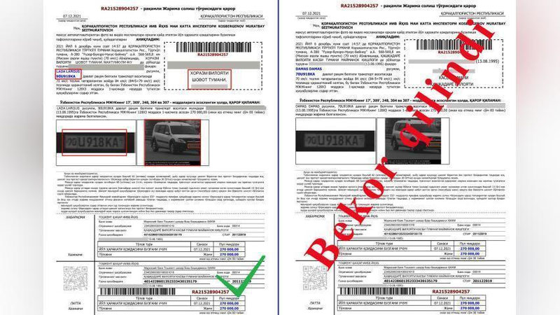2022 йилнинг 6 декабрь куни соат 14:57да Қорақалпоғистон Республикаси, Тўрткўл тумани ҳудудидан ўтувчи А-380 автомобиль йўлининг 568-569,8-километрлари оралиғида, "Lada Largus" русумли, 90U918KA давлат рақам белгили автомобиль ҳайдовчиси 70 км/соат тезлик чегараланган жойда 84 (84-5=79) км/соат тезликда ҳаракатланганлиги махсус мослама ёрдамида қайд этилган бўлиб, қайд этиш вақтида автоматик тарзда 90U918KA давлат рақам белгисидаги "9" рақами "7" бўлиб, 70U918KA тарзида нотўғри қайд этилганлиги, масъул назоратчи ходимнинг эътиборсизлиги сабаб, ушбу жарима "Damas" русумли, 70U918KA давлат рақам белгили автомобиль мулкдорининг яшаш манзилига юборилганлиги маълум бўлди.