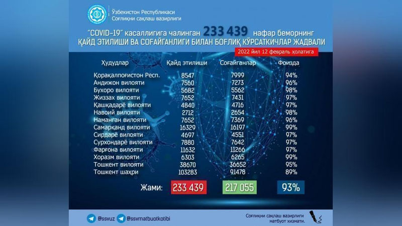 2022 йил 12 февраль ҳолатига кўра, Ўзбекистонда коронавирус инфекцияси қайд этилганлар сони 233439 (+439) нафарни ташкил этмоқда. Бу ҳақда ССВ хабар бермоқда.