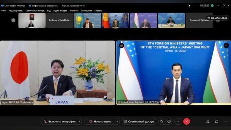 15 апрель куни видеоконференция шаклида "Марказий Осиё + Япония" Мулоқоти ташқи ишлар вазирларининг 8-йиғилиши бўлиб ўтди. Тадбирда Япония, Ўзбекистон, Қозоғистон, Туркманистон, Қирғизистон ва Тожикистон ҳукуматлари вакиллари ва ташқи ишлар идоралари раҳбарлари иштирок этди. Ўзбекистон Республикаси номидан йиғилишда Бош вазир ўринбосари - инвестициялар ва ташқи савдо вазири С.Умурзаков қатнашди. Бу ҳақда инвестициялар ва ташқи савдо вазирлиги матбуот хизмати маълум қилди.
