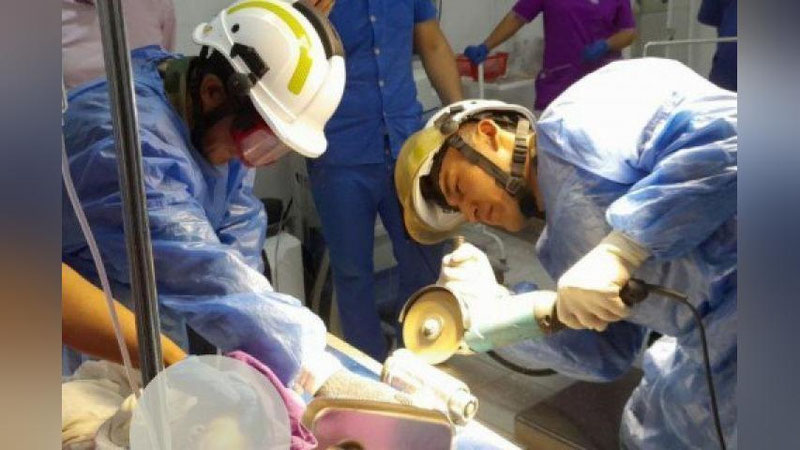 Шифокорнинг сўзларига кўра, гўдак касалхонага олиб келинганида унинг чап қўлида катта ҳажмда эзилиб, йиртилган жароҳат бўлган. Шунингдек, билак, тирсак ва кафт суякларининг синиши қайд этилган. Тиббиёт ходимлари томонидан жароҳатга бирламчи ишлов берилган ҳамда маҳаллий пластик операциялари ўтказилган.
