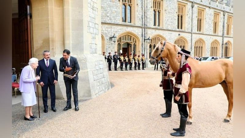 Report ахборот агентлигининг хабар беришича, қироличага Озарбайжон президенти Илҳом Алиев совғаси – Қорабоғ оти топширилди.