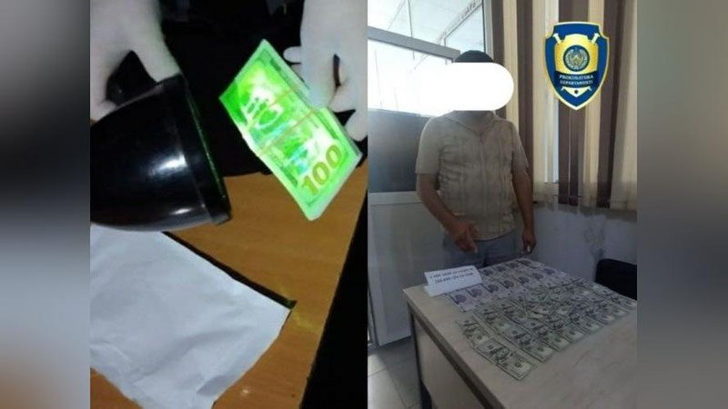 Бош прокуратура ҳузуридаги Департаментнинг Андижон вилоят бошқармаси томонидан фуқароларнинг ҳуқуқ ва манфаатларини ҳимоя қилиш юзасидан ўтказилган тезкор тадбирда, фуқаро И.Ж. бошқа бир фуқаро А.га танишлари ёрдамида тижорат банкларининг биридан уй-жой қуриш учун 150 млн сўм кредит ажратиб бериш ҳамда ҳеч қаерда ишламасада иш хақи ҳисобланганлиги ҳақида маълумотнома олиб бериш эвазига жами 1 900 АҚШ доллари ва 280 минг сўмини олган вақтида ашёвий далиллар билан ушланган.