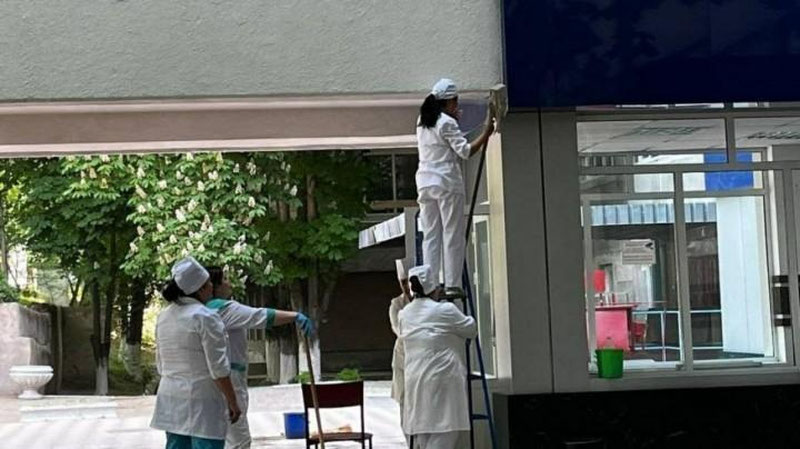 Блогер Никита Макаренко ўзининг телеграм каналида Тошкентнинг Мирзо Улуғбек туманидаги поликлиника ҳудудини тозалаш ишлари олиб борилаётган тиббиёт ходимлари тасвирланган "Ўзбекистонда шифокор тақдири" деб номланган суратни эълон қилди.