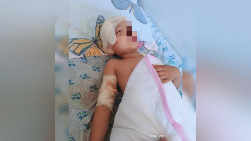 Болада ўнг юзи, иккала қулоқ супраси, чап ўмров соҳаси, кўкрак қафаси орқа юзаси, иккала елка, думғаза соҳасида ит тишлаган жароҳатлари бор, даволаниш жараёнлари вилоят соғлиқни сақлаш бошқармаси бошлиғи ва тиббий марказ директори назоратига олинган, болада қутуриш аломатлари йўқ.