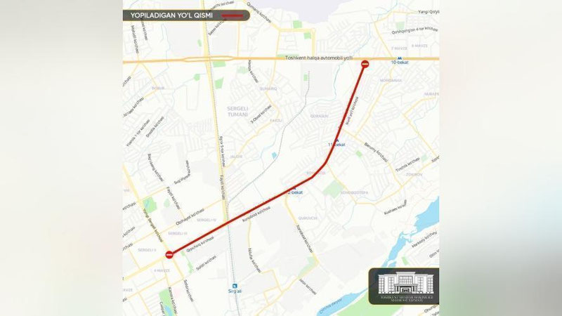 Шу муносабат билан 19 июль куни соат 15:00 дан 21 июль 21:00 га қадар Нурлийўл кўчасининг ТҲАЙ билан кесишмасидан Хонобод 1-тор ва Қипчоқ кўчалари бўйлаб Янги Сергели ва Қипчоқ кўчалари кесишмасигача бўлган оралиқдаги йўл вақтинча тўлиқ ёпилади.