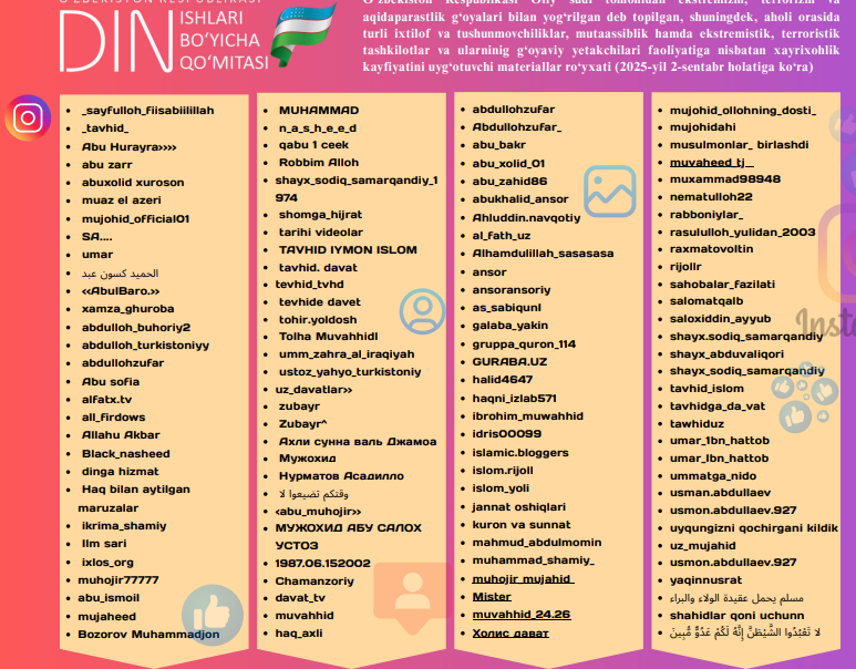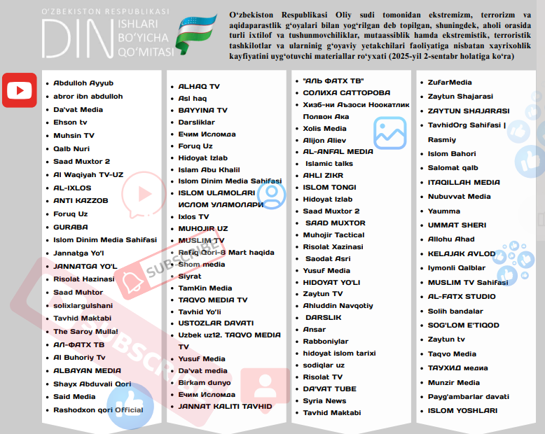 Ўзбекистон Республикаси Дин ишлари бўйича қўмитаси 2025 йил 2 сентябр ҳолатига кўра, экстремизм ва терроризм ғоялари билан йўғрилган деб топилган, республика ҳудудига олиб кириш, тайёрлаш, тарқатиш ва намойиш этиш тақиқланган материаллар рўйхатини эълон қилди.