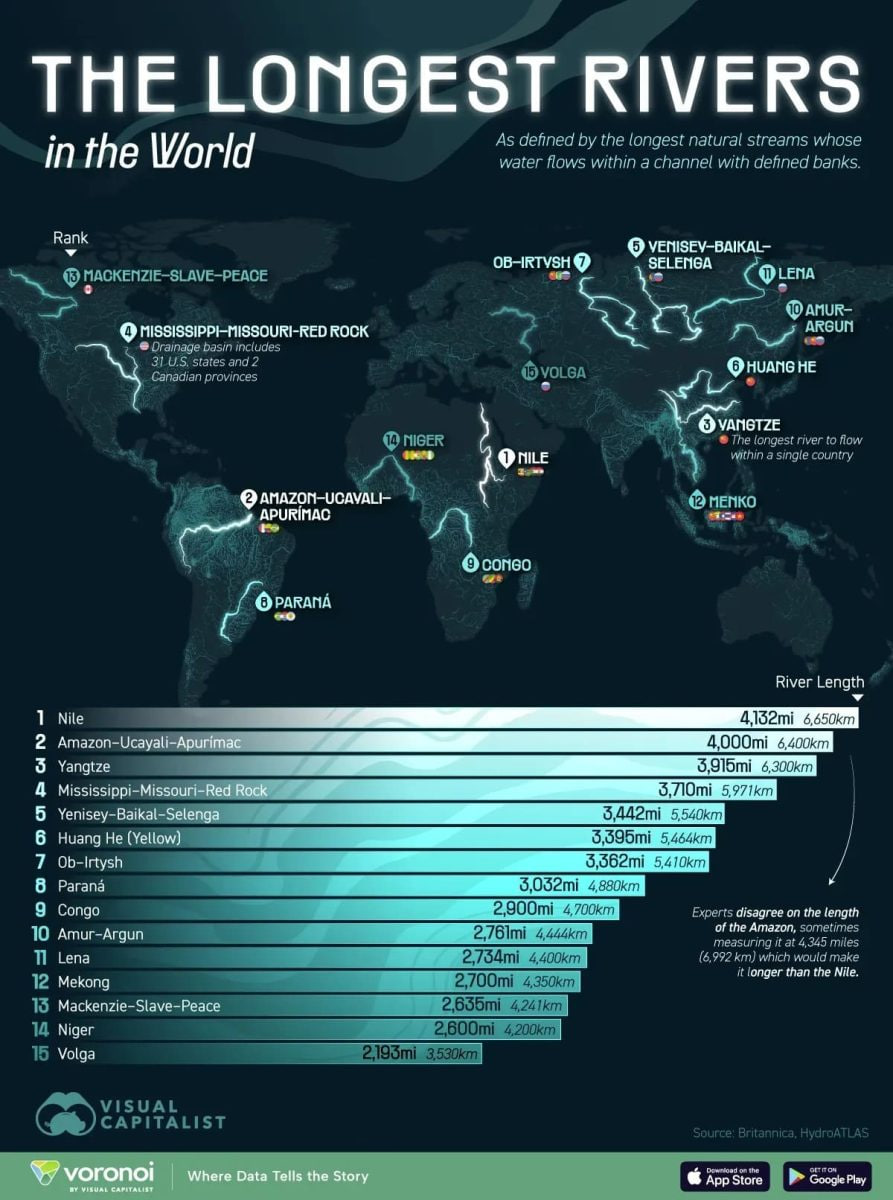 Visual Capitalist эълон қилган инфографика Ердаги энг узун 15 дарёни кўрсатади. Унда ҳар бир сув тизимининг узунлиги ва неча мамлакат ҳудудидан оқиши акс этган.