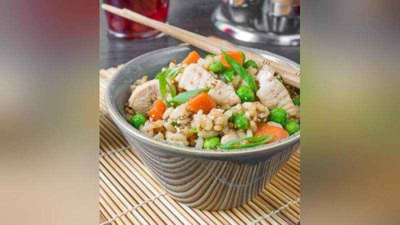Зарур масаллиқлар: 400 гр. товуқ гўшти, 200 гр. димлаб пиширилган гуруч, 150 гр. консерваланган кўк нўхат, 50 мл. соя соуси, 3 дона тухум, 3 бўлак саримсоқпиёз, 1 бош пиёз, битта сабзи, ўсимлик ёғи, кўкпиёз.