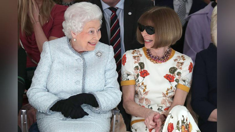 Қиролича Vogue журналининг муҳаррири Анна Винтур ва Британия мода кенгаши раиси Кэролайн Раш билан ўтирди. Меҳмон диққат билан либослар намойишини томоша қилди.
