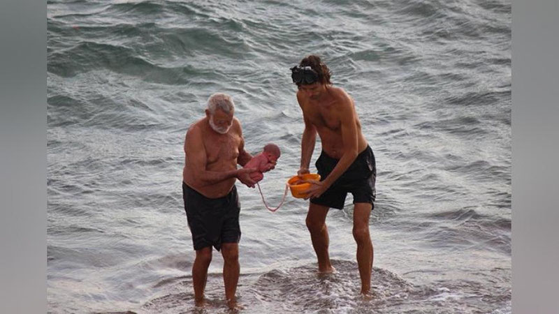 Суратларда аёл худдики сувдан чўмилиб чиқаётгандек, эри ва отаси эса янги туғилган чақалоқни денгиз қирғоғига олиб чиқаётганлари акс этган.
