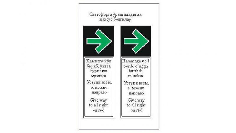 Ҳозирда бу белгилар пойтахтнинг Нурафшон-Беруний, Нурафшон-Уйғур кўчалари кесишган чорраҳаларга ўрнатилди, бунда барча транспорт воситалари ва пиёдаларга йўл бериб, ўнгга светофорнинг қизил чироғига бурилишига рухсат берилади.