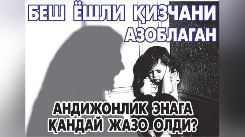 — Мазкур ҳолат бўйича жиноят иши ҳужжатларига кўра, Ўзбекистон Республикаси ЖКнинг 110-моддаси 2-қисми “а,в” бандлари билан айбланган судланувчининг маълумоти ўрта, ишсиз, муқаддам судланмаган. Иш бўйича 2017 йил 30 август кунидан гаров эҳтиёт чораси қўлланилган. Ўзи истиқомат қиладиган хонадонда 2017 йил 13 февраль кунидан 2017 йил 1 август кунига қадар қарамоғида бўлган ожиз аҳволдаги, 2013 йилда туғилган вояга етмаган Шаҳризодани Қозоғистонда ишлаш учун кетган онасини соғиниб йиғлаган вақтида, уни овутиш ўрнига йиғламаслиги учун баданининг турли жойларига қўллари, ёғоч таёқ ва темир бўлаги билан уриб, чимчилаб, оғзини беркитиб, белига қайноқ сув қуйиб, муттасил равишда қийнаб келган. Ана шундай қийноқлар билан қизчага қисқа муддатли соғлиқнинг бузилишига олиб келган енгил тан жароҳати етказган.