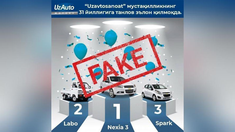 Ijtimoiy tarmoqlarda o`zini “O`zavtosanoat” AJ deb ko`rsatayotgan va kompaniya nomidan tanlov o`tkazayotgan soxta akkaunt paydo bo`lgan. "UzAuto Motors" fuqarolarga ogohlantirish bilan chiqdi.