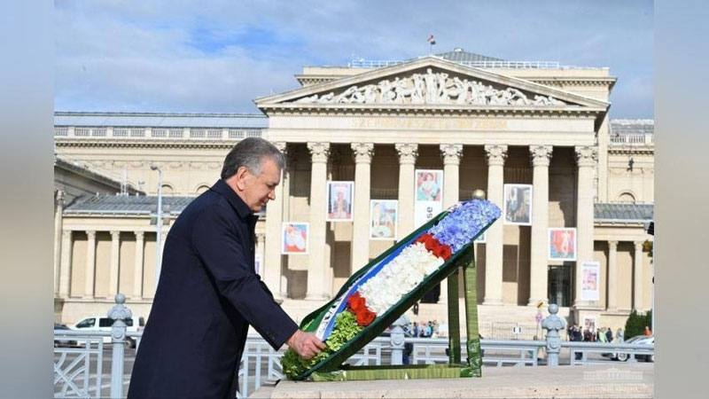 Shavkat Mirziyoev Budapeshtning Qahramonlar maydonidagi xotira ustuni poyiga gulchambar qo`ydi