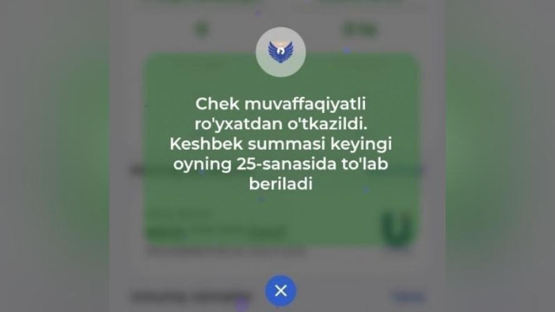 Fiskal belgili xarid cheki Soliq mobil ilovasi orqali skaner qilinganda "Chek muvaffaqiyatli ro`yxatdan o`tkazildi. Keshbek summasi keyingi oyning 25-sanasidan so`ng to`lab beriladi" xabar paydo bo`ladi.