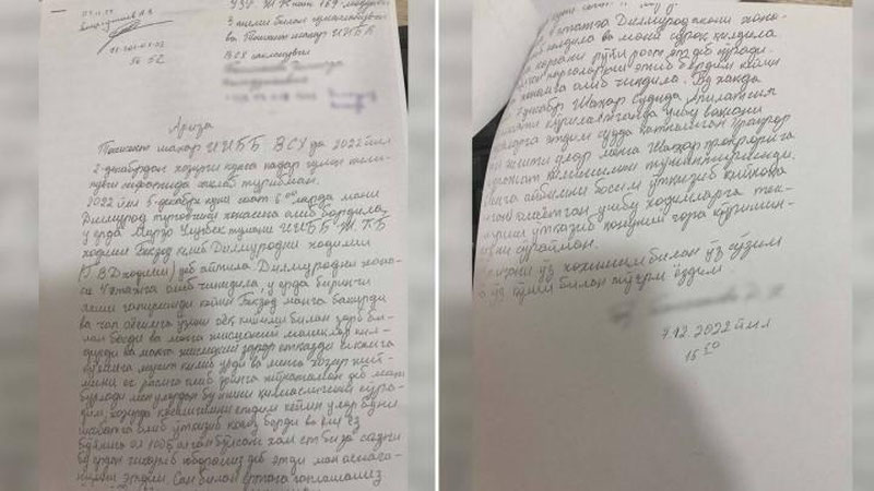 Hozirda kasal ekanimni aytdim. Keyin ular buni inobatga olib, o`tqazishdi va qo`limga qog`oz tutqazishdi. Ular menga o`g`rilikni bo`yningga ol, 100 dollar olgan bo`lsang ham yoz deyishdi. Ular shunday qilsam, meni chiqarib yuborishlarini aytishdi. Men esa pul olmaganimni aytdim. Ular shundan keyin sen bilan ertaga gaplashamiz, deyishdi, — deyiladi gumonlanuvchi ayolning Toshkent shahar prokuraturasiga yozilgani aytilgan arizasida.