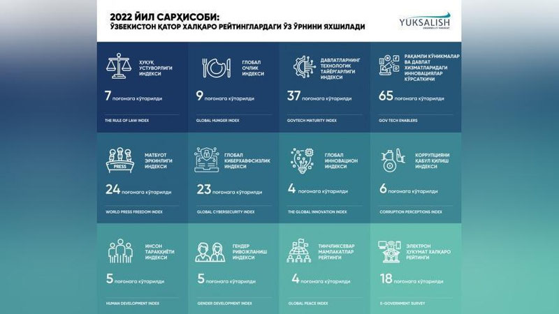 2022 yilda e`lon qilingan xalqaro reytinglarda O`zbekiston o`z o`rnini yaxshiladi. Masalan, GovTech Enablers indeksining raqamli ko`nikmalar va davlat xizmatlaridagi innovasiyalar ko`rsatkichi bo`yicha dunyoda 4-o`rinni egallab, o`tgan yilga nisbatan 65 pog`onaga ko`tarildi.