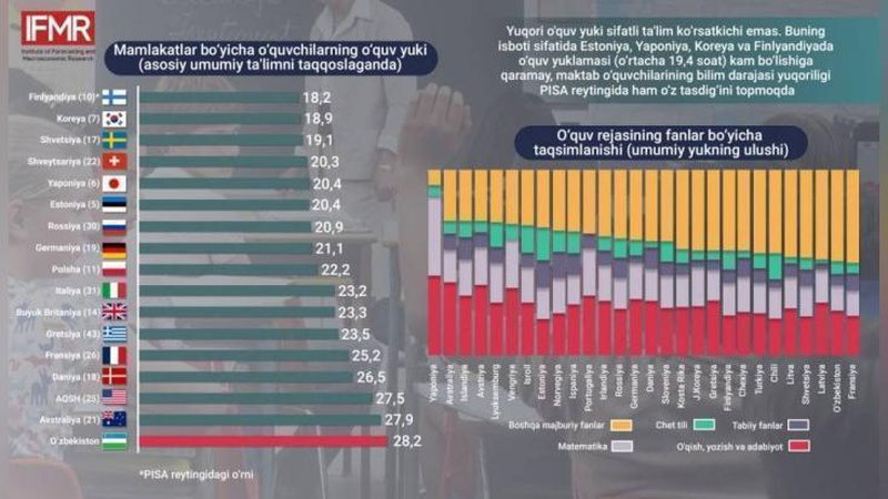 Natijalarga ko`ra, O`zbekistonda o`quvchilar boshqa mamlakatlardagiga qaraganda ancha ko`p o`qiydi. Ular uchun haftalik o`rtacha yuklama 28,2 soatni tashkil qiladi. Lekin o`quvchilar matematika fani bo`yicha nisbatan kamroq tahsil olishi kuzatilgan.