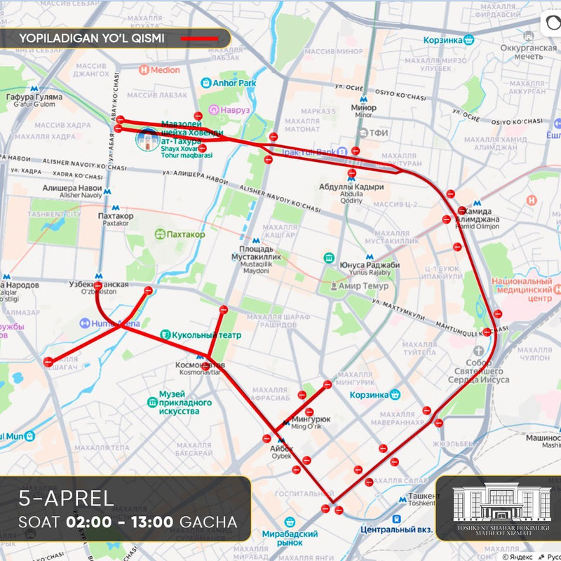 5 aprel (02:00 – 13:00): — Beshog‘och ko‘chasi: Furqat ko‘chasidan Islom Karimov ko‘chasigacha;