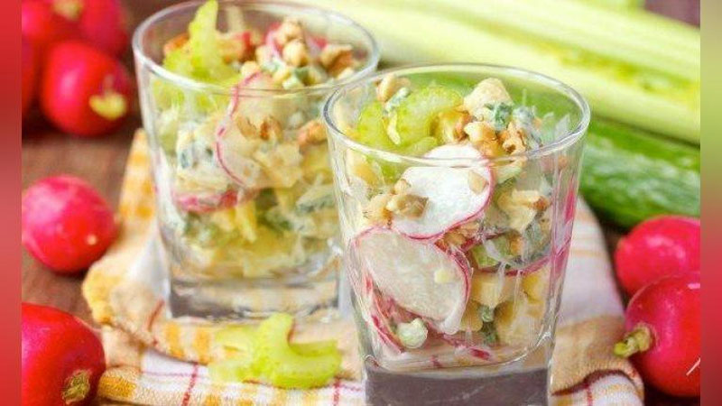 Zarur masalliqlar: 3-4 dona yangi kartoshka, 1 dona bodring, 6 ta yong`oq mag`zi, 5 ta rediska, 2 osh qoshiq smetana, 1 choy qoshiq xantal, ko`kpiyoz, tuz, qora murch.