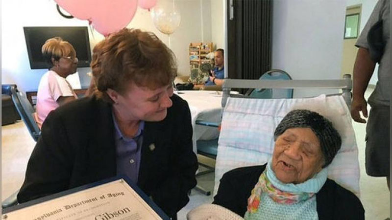 1903 yil 17 avgustda tug`ilgan Delfin Gibson 2004 yildan buyon Pensilvaniyaning Xantingdon shahri qariyalarni parvarish qilish markazida yashab kelayotgan edi. U o`tgan yilda 114 yoshini qarshi olib, AQShning eng keksa fuqarosiga aylangan bo`lgan. 2018 yilning 28 aprelida esa dunyoning eng keksa insonlari ro`yxatiga kirgan.