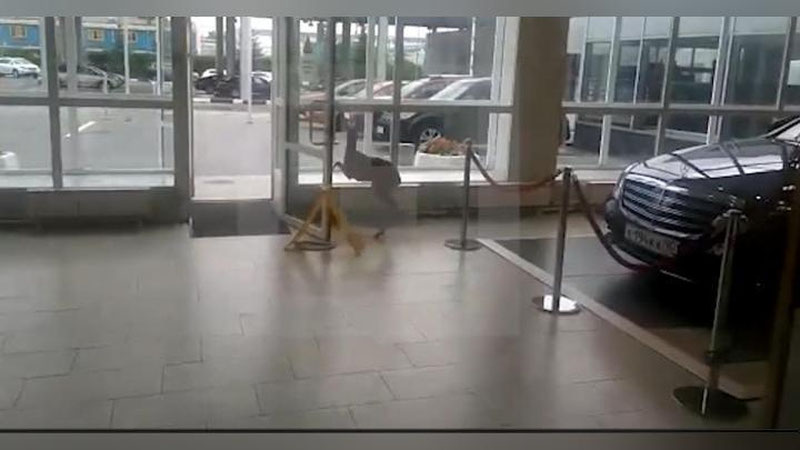 Hurkib ketgan bug`ucha avtosalon ichida rosa irg`ishladi. Avtosalon xodimlari esa bug`u bolasini tutishga harakat qilib toza ovora bo`lishdi. Oxir-oqibat, jonivor peshoynaga o`zini urib, oynalarni sindirgancha tashqariladi.