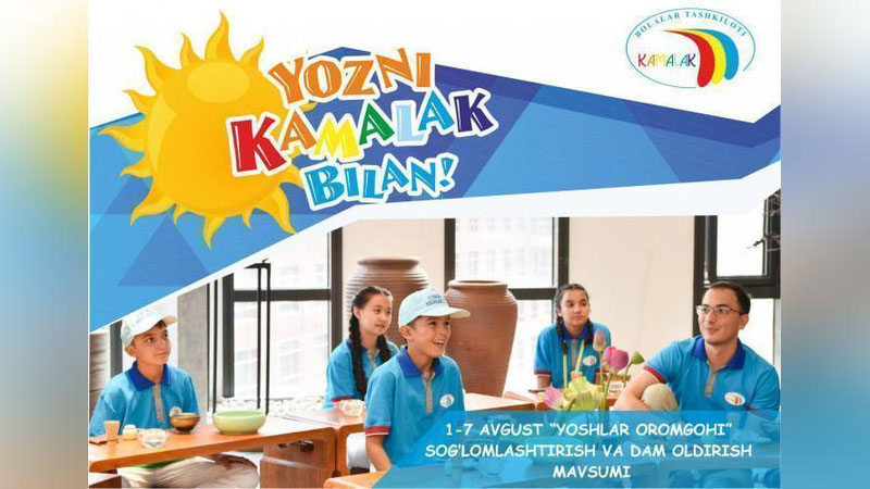 "Kamalak" bolalar tashkiloti tomonidan yoz mavsumida bolalarning bo`sh vaqtlarini mazmunli tashkil etish, ularni sog`lom turmush talablari asosida tarbiyalash, bolalar orasida sportning ommaviy turlarini keng targ`ib qilish, siyosiy-huquqiy dunyoqarashini shakllantirish hamda ma`naviy hordiq olishlarini tashkil etish maqsadida joriy yilning 1-7 avgust kunlari Toshkent viloyatida joylashgan "Yoshlar oromgohi"da "Yozni "Kamalak" bilan!" loyihasi doirasida sog`lomlashtirish va dam oldirish mavsumi tashkil etiladi.