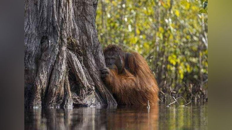 Timsohlar qaynayotgan Borneo daryosini kechib o`tayotgan orangutan yirtqichlardan daraxt orqasiga yashirinmoqda.