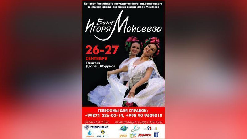 Joriy yilning 26-27 sentyabr kunlari Toshkentdagi “O`zbekiston” xalqaro anjumanlar saroyida Igor Moiseev nomidagi Rossiya davlat akademik xalq raqs ansamblining konserti bo`lib o`tadi...