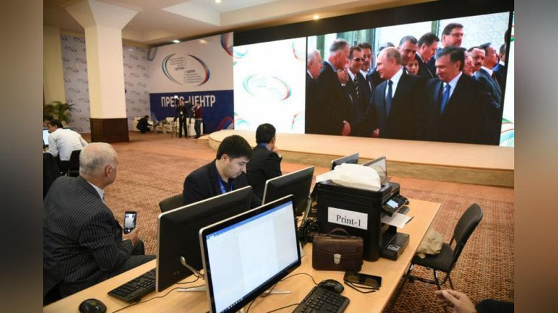 «O`zekspomarkaz»da tashkil etilgan matbuot markazida ommaviy axborot vositalari xodimlari tashrif tafsilotlarini kuzatib bormoqda.