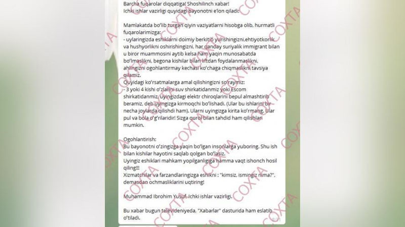 Ijtimoiy tarmoqlarda "Barcha fuqarolar diqqatiga! Shoshilinch xabar! Ichki ishlar vazirligi quyidagi bayonotni e`lon qiladi" deb boshlanib, tarqatilgan e`lon O`zbekiston Respublikasi Ichki ishlar vazirligi tomonidan tayyorlanmaganligini ma`lum qilamiz, deb xabar bermoqda O`zbekiston Respublikasi Ichki ishlar vazirligi Jamoatchilik va OAV bilan aloqalar boshqarmasi.