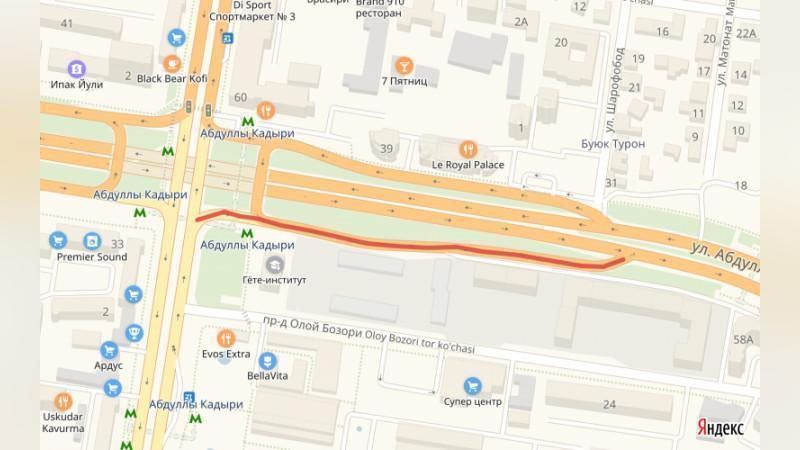 Toshkent shahar hokimining tegishli farmoyishiga muvofiq, haydovchi va piyodalar xavfsizligini ta`minlash maqsadida poytaxtimizning Amir Temur ko`chasidan Abdulla Qodiriy ko`chasiga tutash yo`li 2019 yilning 1 avgust kuniga qadar vaqtinchalik yopiladi.