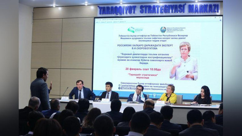 O`zbekiston Yoshlar ittifoqi hamda Vazirlar Mahkamasi huzuridagi Ta`lim sifatini nazorat qilish davlat inspeksiyasi tashabbusi bilan “Taraqqiyot strategiyasi” markazida Rossiyaning “Glavekspertsentra” tashkiloti bosh eksperti Vera Skorobogatova bilan ochiq muloqot tashkil etildi.