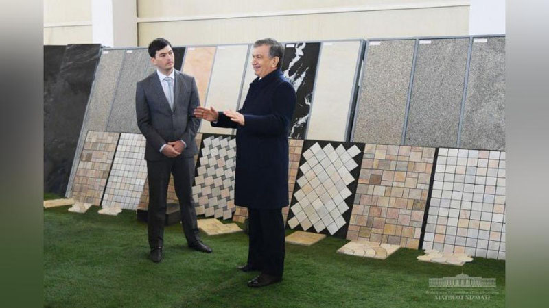 Davlatimiz rahbari korxona mahsulotlarini ko`zdan kechirar ekan, ular jahondagi muqobillaridan qolishmasligini ta`kidladi. Samarali texnologiyalarni qo`llash, transport xarajatlarini arzonlashtirish hisobidan mahsulotlar tannarxini kamaytirish, shu orqali tashqi bozorlarga chiqish bo`yicha topshiriqlar berdi. Pardozbop toshlarni jahon standartlari asosida chuqur qayta ishlaydigan kadrlar tayyorlash, bunyodkorlik ishlarida mahalliy qurilish materiallaridan foydalanish zarurligi qayd etildi.