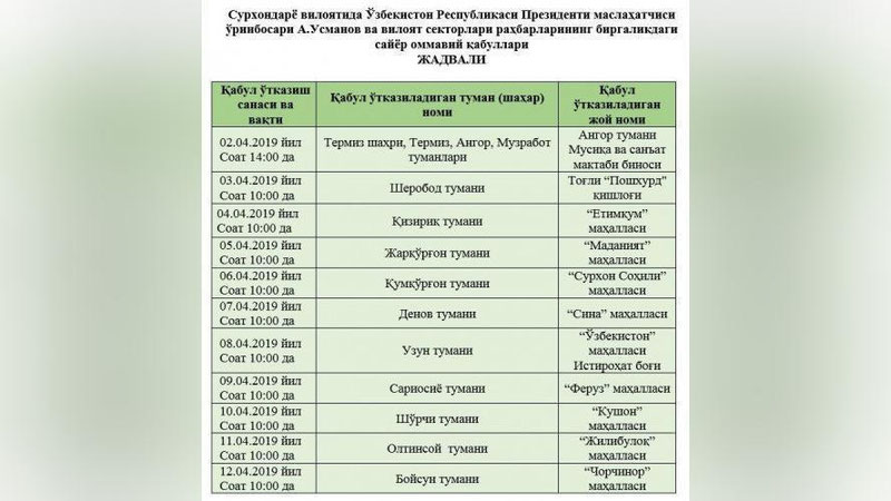 Surxondaryo viloyatida O`zbekiston Respublikasi Prezidenti maslahatchisi o`rinbosari A.Usmanov va viloyat sektorlari rahbarlarining birgalikdagi sayyor ommaviy qabullari jadvali taqdim etiladi.