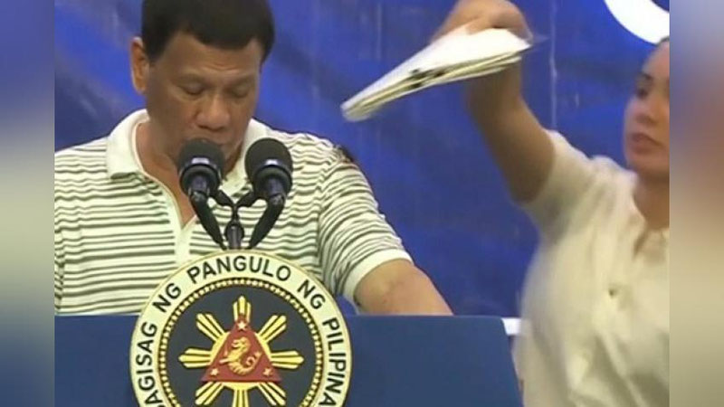 Rodrigo Duterte senatga murojaat qilayotgan payt uning elkasiga katta suvarak chiqib oladi. Ammo u bunga e`tibor qilmaydi. Bir zumdan so`ng uning yordamchisi kelib, suvarakni olib tashlamoqchi bo`ladi. Keyin Dutertening o`zi uni qo`llari bilan silkib tashlaydi va suvarakni muxolif tomon jo`natgan deya hazillashib, o`z nutqini davom ettiradi.