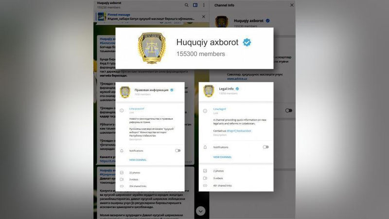 “Huquqiy axborot (https://t.me/huquqiyaxborot)”, “Pravovaya informasiya (https://t.me/pravoinf)”, “Legal Info (https://t.me/leginf)” kanallari Telegram tarmog`ida verifikasiya qilindi...
